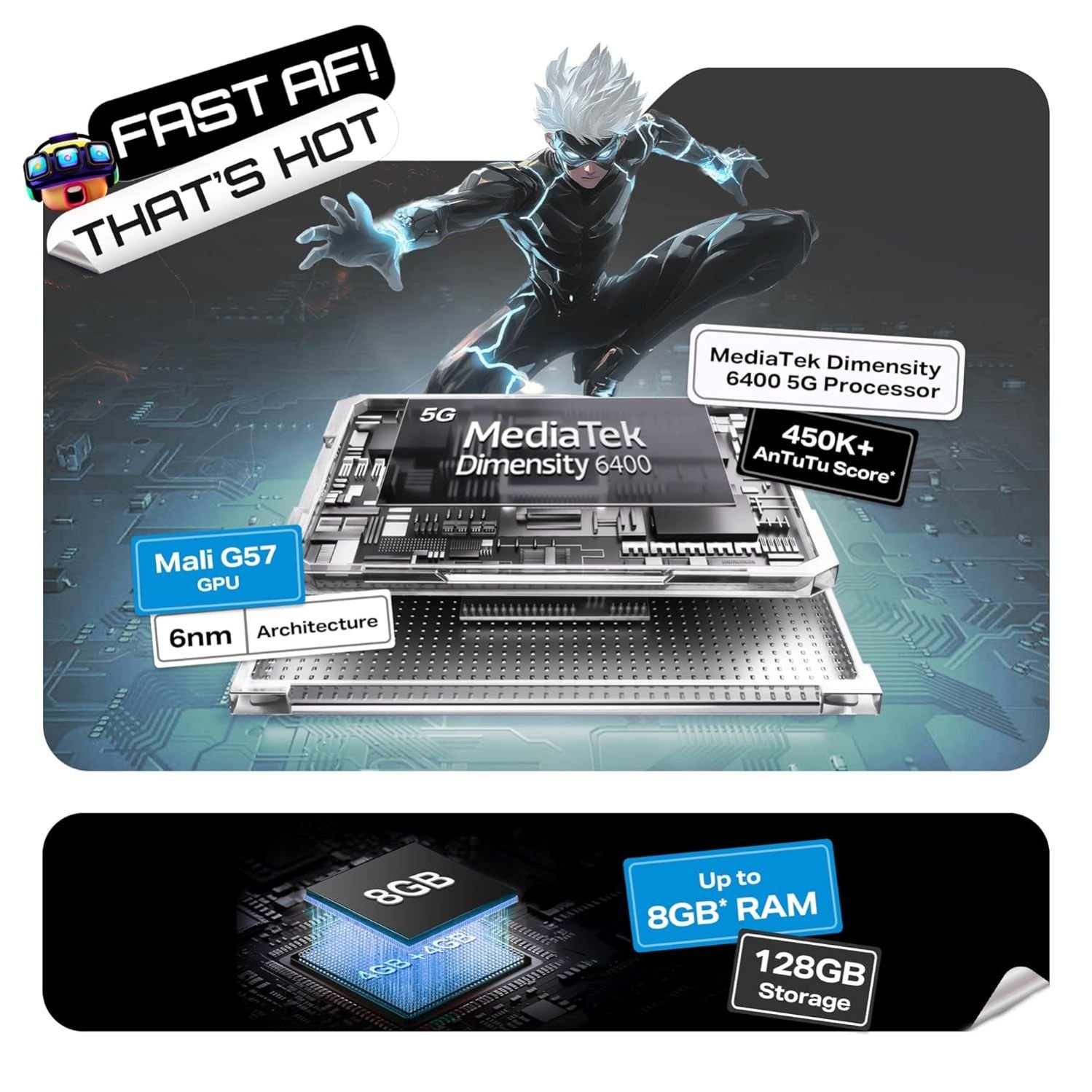 4 GB RAM | 128 GB ROM 17.14 cm (6.75 inch) HD+ Display 50MP Rear Camera | 5MP Front Camera 6000 mAh Battery Dimensity 6400 Processor