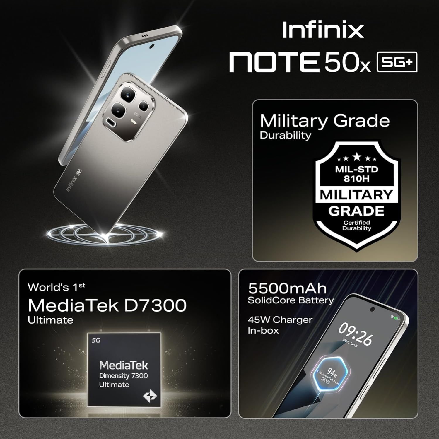 The Infinix Note 50X 5G delivers a flagship-inspired performance package—with a capable Dimensity 7300 Ultimate processor, smooth 120 Hz display, robust 5500 mAh battery with fast/reverse charging, stylish and durable build, and a rounded camera setup—all at a wallet-friendly price. It’s an excellent option for users focused on performance and battery life, willing to compromise slightly on display resolution or the audio port.