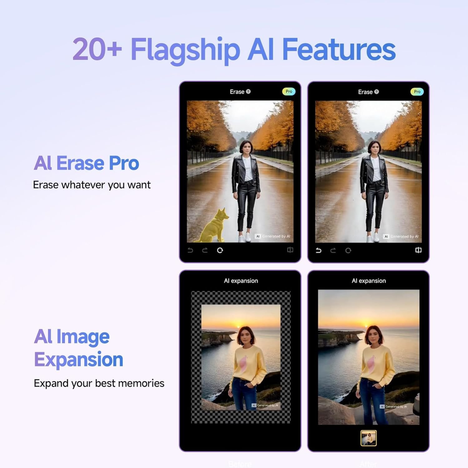 AI features: AI Erase Pro, AI Expansion, AI Cutout, AI SmartClip.