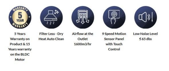 Equipped with a motion sensor, users can operate the chimney with a simple wave of the hand. This touch-free control enhances convenience and keeps the control panel free from grease and fingerprints.