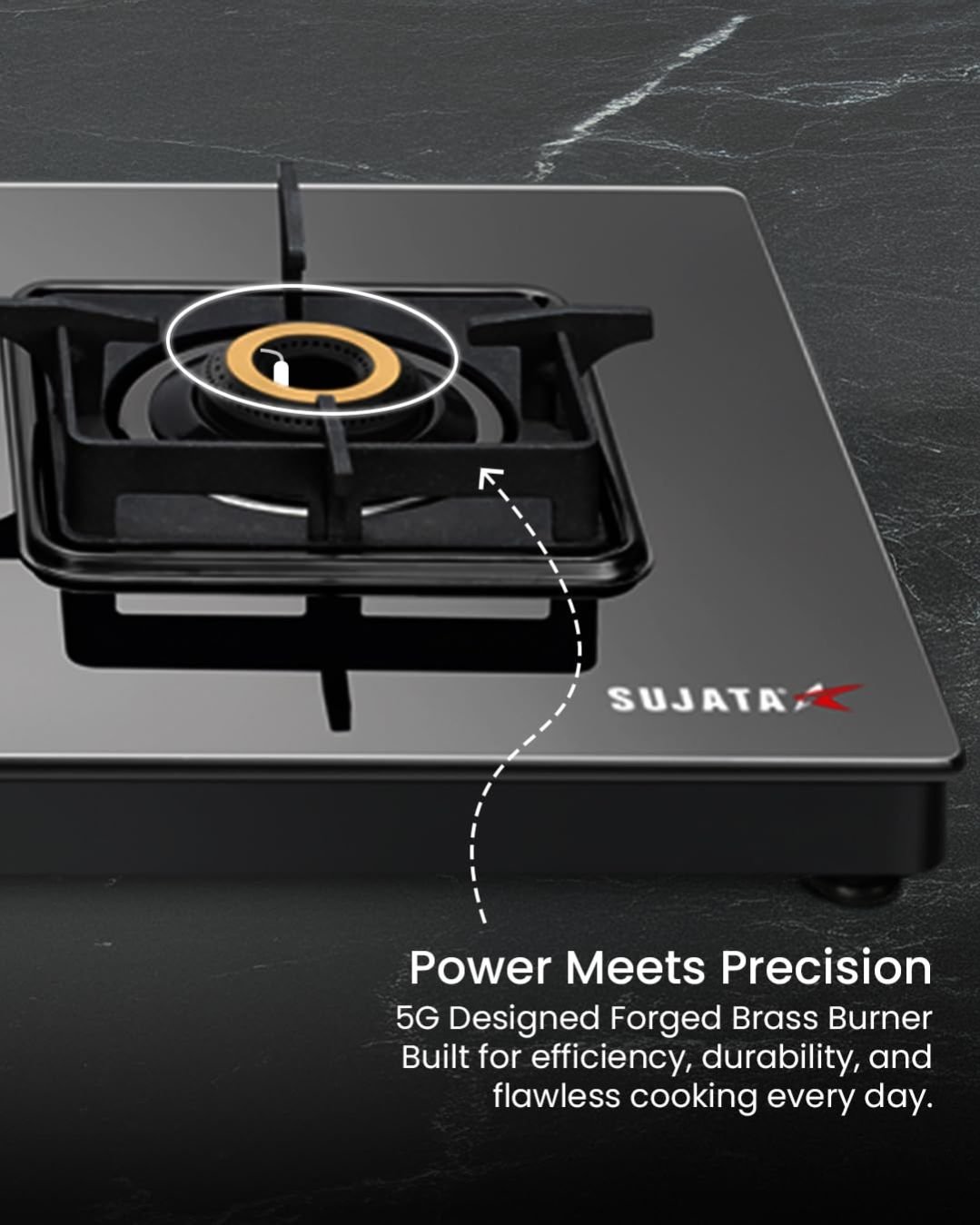 The unit incorporates forged brass burners, designed with “5G” geometry tailored for Indian cooking styles — facilitating faster heat-up, strong flame and efficient cooking of larger pots.