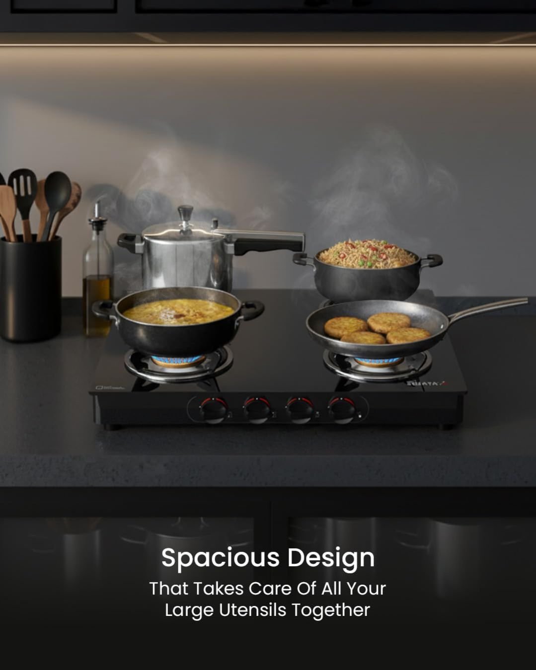 Rigid and stable pan supports with flame guards help in gas saving and ensure secure placement of cookware.